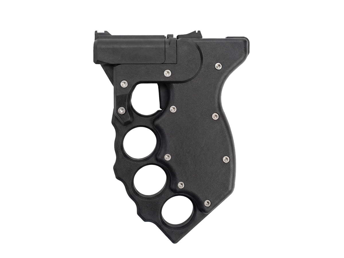 The Brawler takes the proven Harlot platform and wraps it in a knuckle duster frame that’s equal parts functional firearm and conversation piece. This single-shot .22LR break-action derringer includes the same reliable operation as the original Harlot in a grip style that’s genuinely unique in the 3D printed firearms space.