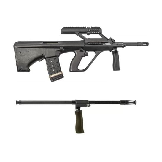 The Steyr AUG Barrel 5.56mm 20″ in sleek black. Crafted from premium Chrome-Moly 4150 steel with a durable black coating, this barrel is compatible with all Steyr AUG models from the A1 to the latest AUG A3 M1. Boasting a 1:9 twist rate and a 1/2″ x 28 barrel thread pitch, it features a tulip-style flash hider for enhanced performance. Plus, the black foregrip comes pre-installed for convenience. Ensure your AUG maintains peak performance and reliability with this genuine factory-original barrel.