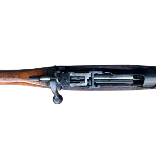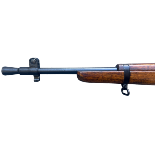 Designed in 1944 and primarily issued to British and Commonwealth forces in the Pacific and Southeast Asian theaters, the No.5 MK1 was renowned for its mobility and effectiveness in close-quarter jungle warfare. This model includes a rubber recoil pad, “lightening cuts” in the receiver and barrel to reduce weight, and a side-mounted rear sight adjustable for range.