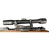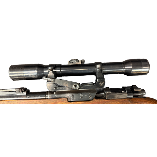 Fitted to this rifle is a Kahles 4×60 sniper scope — a period-correct optic widely used on German long-range rifles. The scope is mounted on original low-turret mounts that clamp to the receiver in fixed position, preventing forward/back movement when zeroed (the classic fixed-turret style). The Kahles optic is complete and presents with original reticle and windage/elevation knobs; optical condition shows minor internal dust and slight edge wear consistent with age, but no cracked lenses or gross haze. All mount screws and clamp hardware are original to the set and show matching proofs/marks.