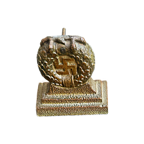 These desk eagles were often awarded as prizes during the Nuremberg rallies and served as presentations to members of the political elite. Typically, they stand approximately 6 inches tall and feature the German national eagle clutching a swastika, mounted on a base. Over time, the original gilt finish on many of these eagles has worn, but well-preserved examples still retain much of their original luster.
