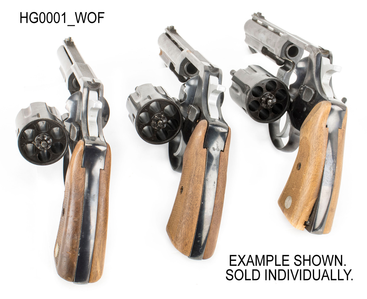 The majority of these revolvers were downgraded from Good condition only because the wood grips are chipped, cracked, or broken. A small handful have a frozen or stiff cylinder release, and another portion have speckled pitting on the barrel and frame.
