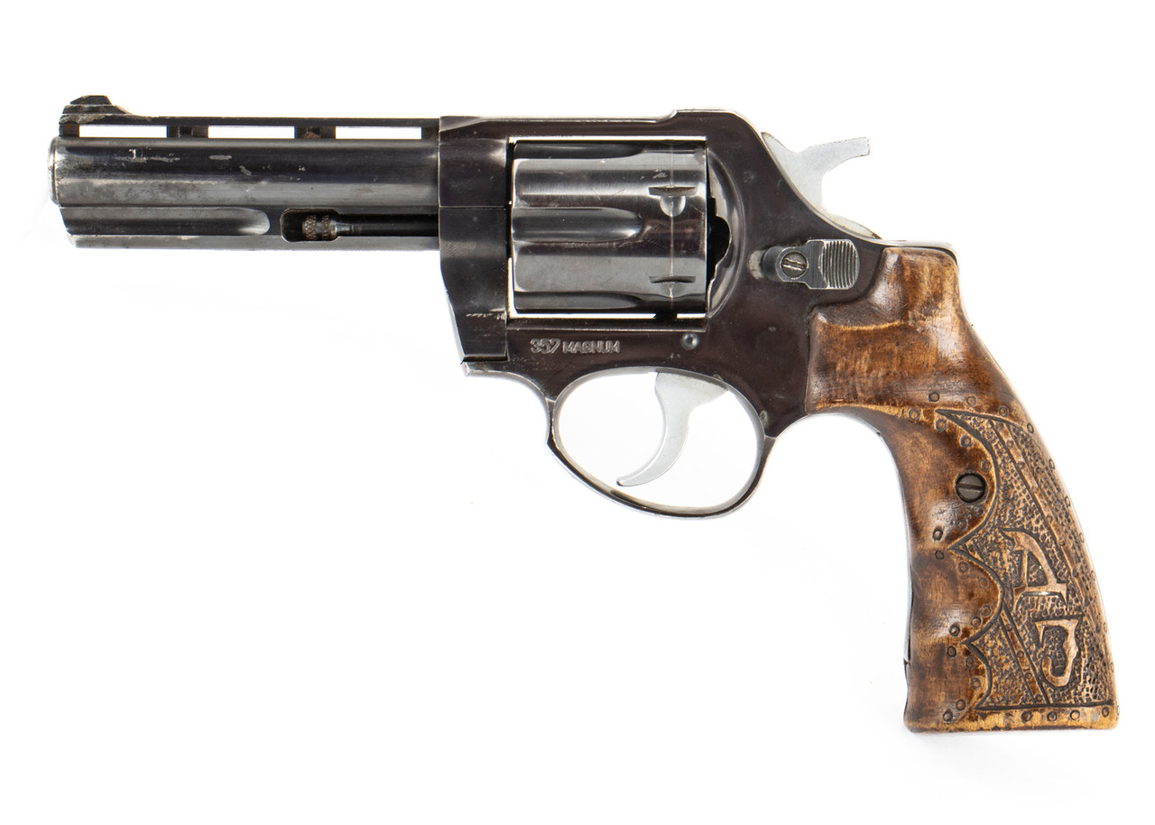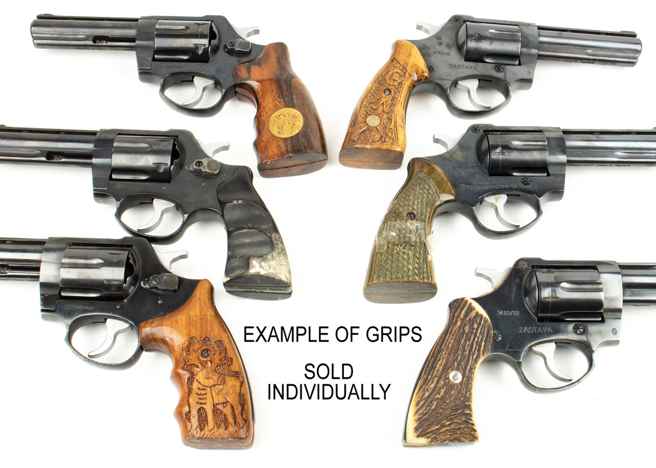 These Good condition M83 revolvers feature one-of-a-kind trench art grips. Every set is unique. The majority of the grips are carved into wood and vary in size and thickness. Additionally, some are carved into plastic, horn, and what appears to be antler. Most of the art appears in the form of wildlife, religious imagery, and vegetation. Some are handcarved target grips. Truly a one-of-a-kind item — we have a limited quantity of these collector’s pieces.